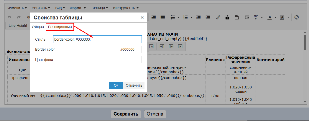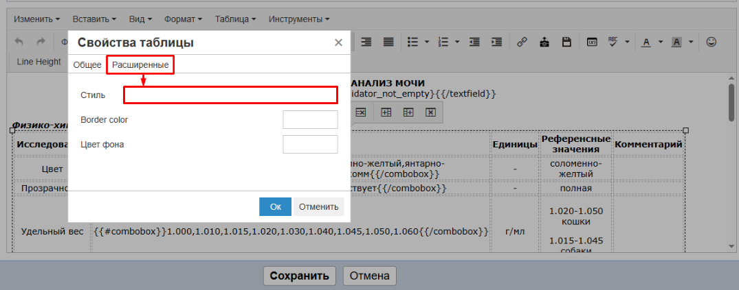 В открывшемся окне перейдите на вкладку "Расширенные" и в поле стиль добавьте текст: