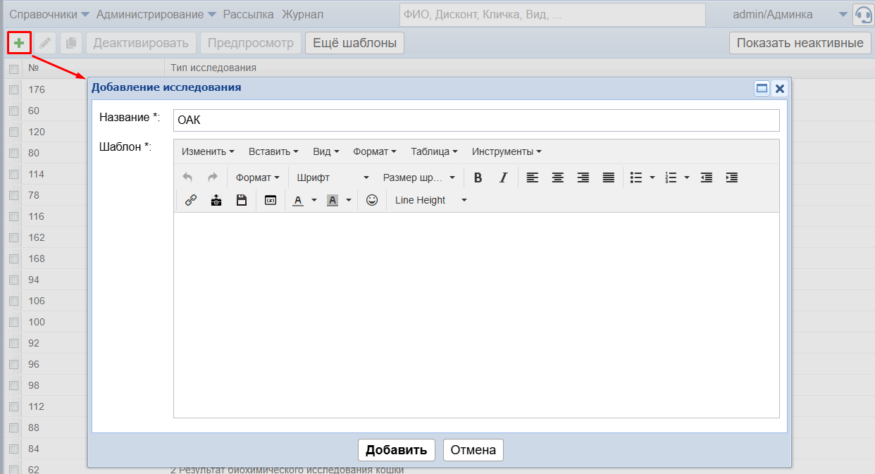 Чтобы создать спецшаблон, нужно зайти в модуль Специальные исследования и на панели нажать кнопку Добавить (зеленый плюс)