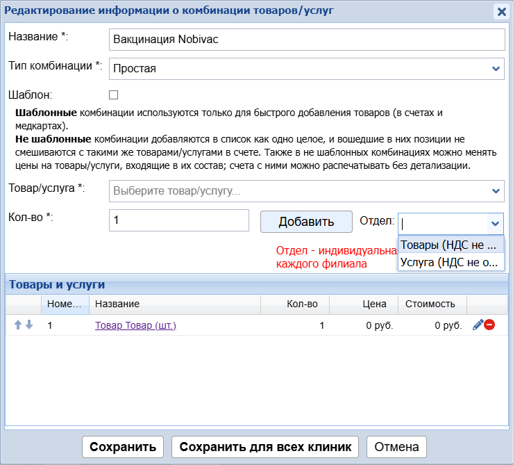 При заведении нового товара/услуги или редактировании в поле Отдел выберите соответствующее значение.