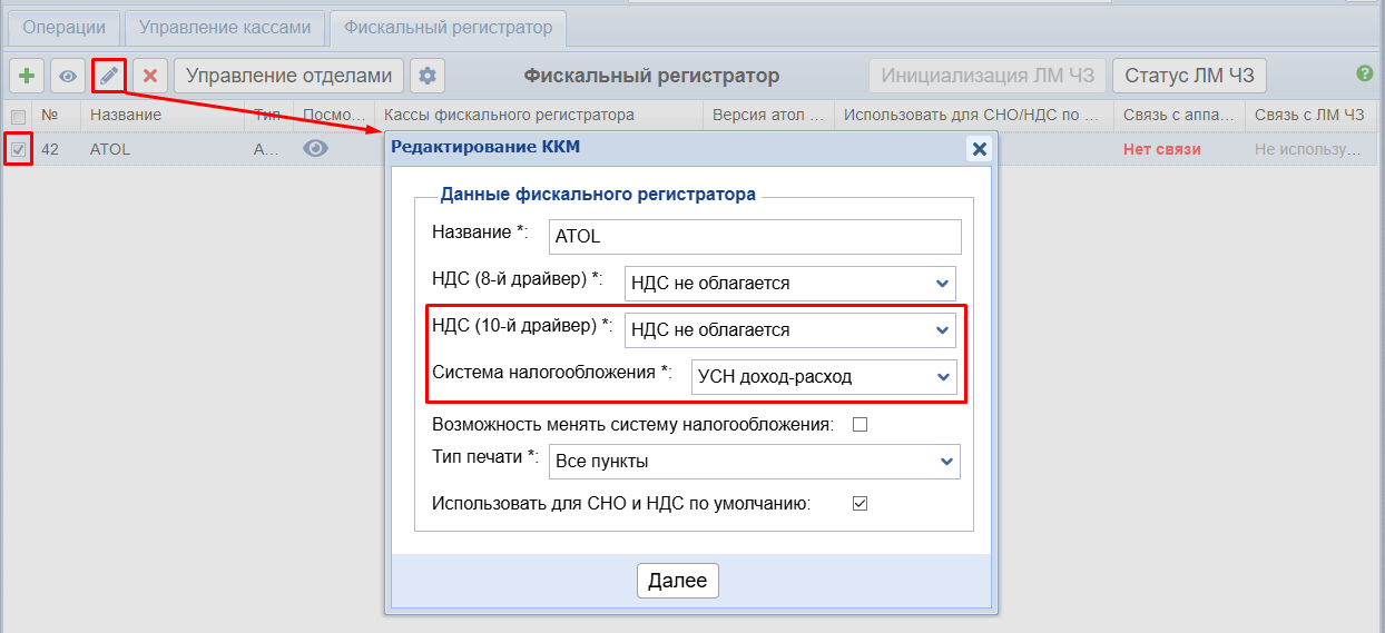 Гашение долга (вне зависимости от того, является ли это оплатой за счет аванса или прямой оплатой через сам счет) будет иметь СНО и НДС отдела по умолчанию (указанного в настройках фискального регистратора).