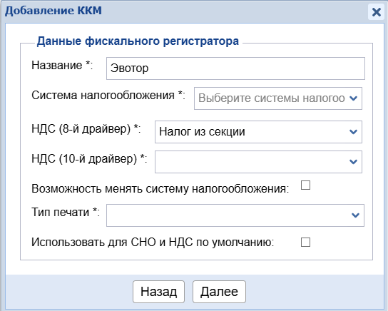 После этого нужно ввести название и выбрать систему налогообложения такую, которая была введена при первой настройке Эвотор.