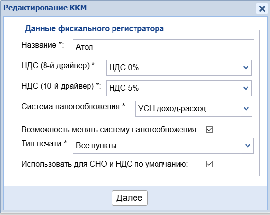 Нажать кнопку Добавить (зеленый +) и выбрать из списка доступных ККМ: АТОЛ, нажать кнопку Далее.