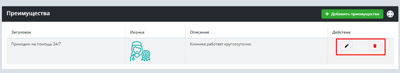 В разделе Преимущества через кнопку Добавить можно добавить преимущества вашей клиники. Если необходимо что-то удалить или отредактировать, то это можно будет сделать через соответствующие кнопки.
