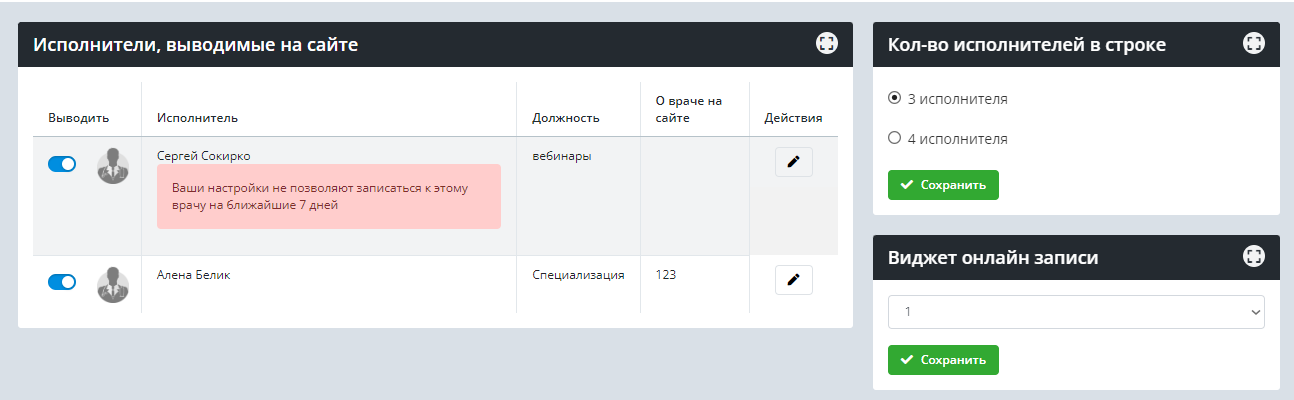В разделе Исполнители отметьте, кого из врачей необходимо выводить на сайте. Также можно выбрать количество исполнителей в строке - 3 или 4.