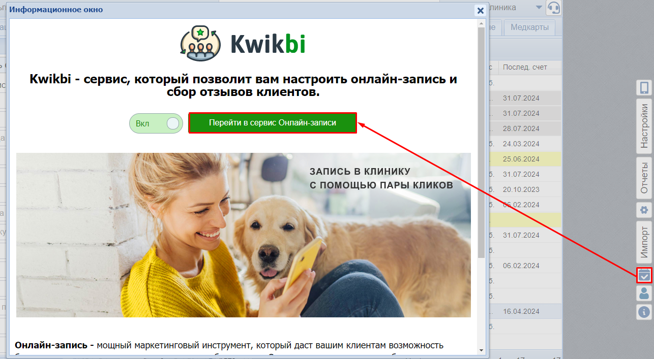 Чтобы настроить сайт клиники через Ветменеджер, необходимо перейти в сервис Kwikbi (виджет Онлайн-записи на прием). Обратите внимание, это дополнительный платный модуль, поэтому чтобы пользоваться его возможностями, нужно предварительно его оплатить и подключить.