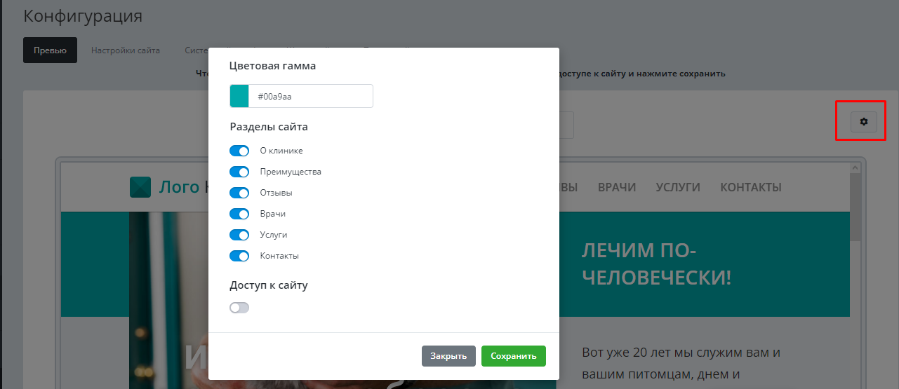Доступ к сайту - если выключить данный тумблер, в превью будет отображаться дефолтный шаблон; если включить - шаблон с вашими данными.