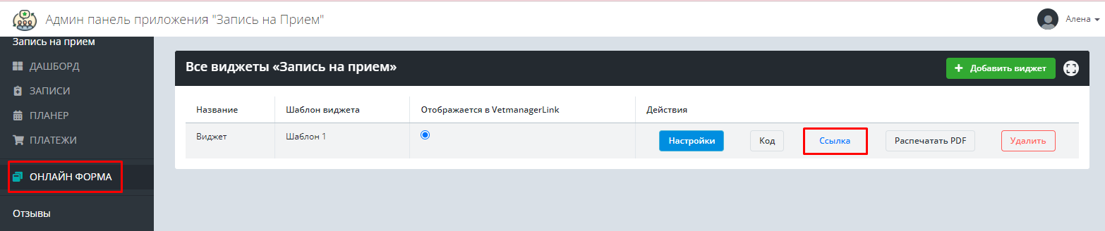 В программе Ветменеджер перейдите в виджет онлайн-записи. В разделе Онлайн-форма копируете ссылку на виджет онлайн-записи. Если вы еще не настраивали такую запись — вот инструкция, как это сделать.