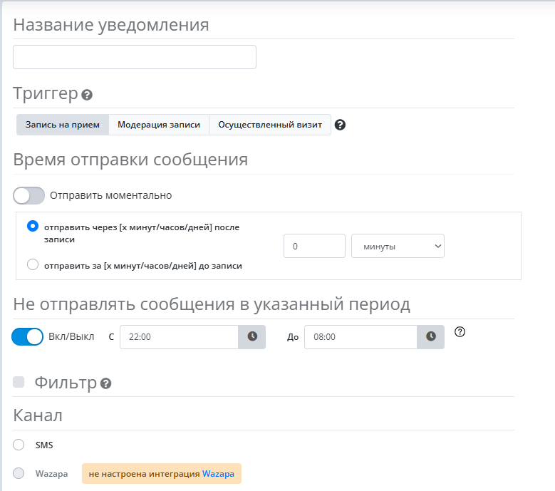 В Уведомлениях по умолчанию добавлено Уведомление о подтверждении записи клиентом. Чтобы оно работало, его необходимо включить. Предварительно вы можете отредактировать текст, выбрать канал отправки сообщения, добавить блокировку по времени и фильтр при необходимости.