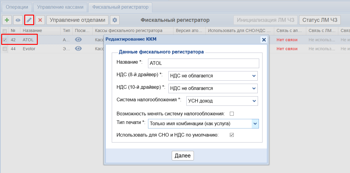 Перейти в Кассы — вкладка “Фискальный регистратор”, выделить строку с фискальным регистратором и нажать карандаш.