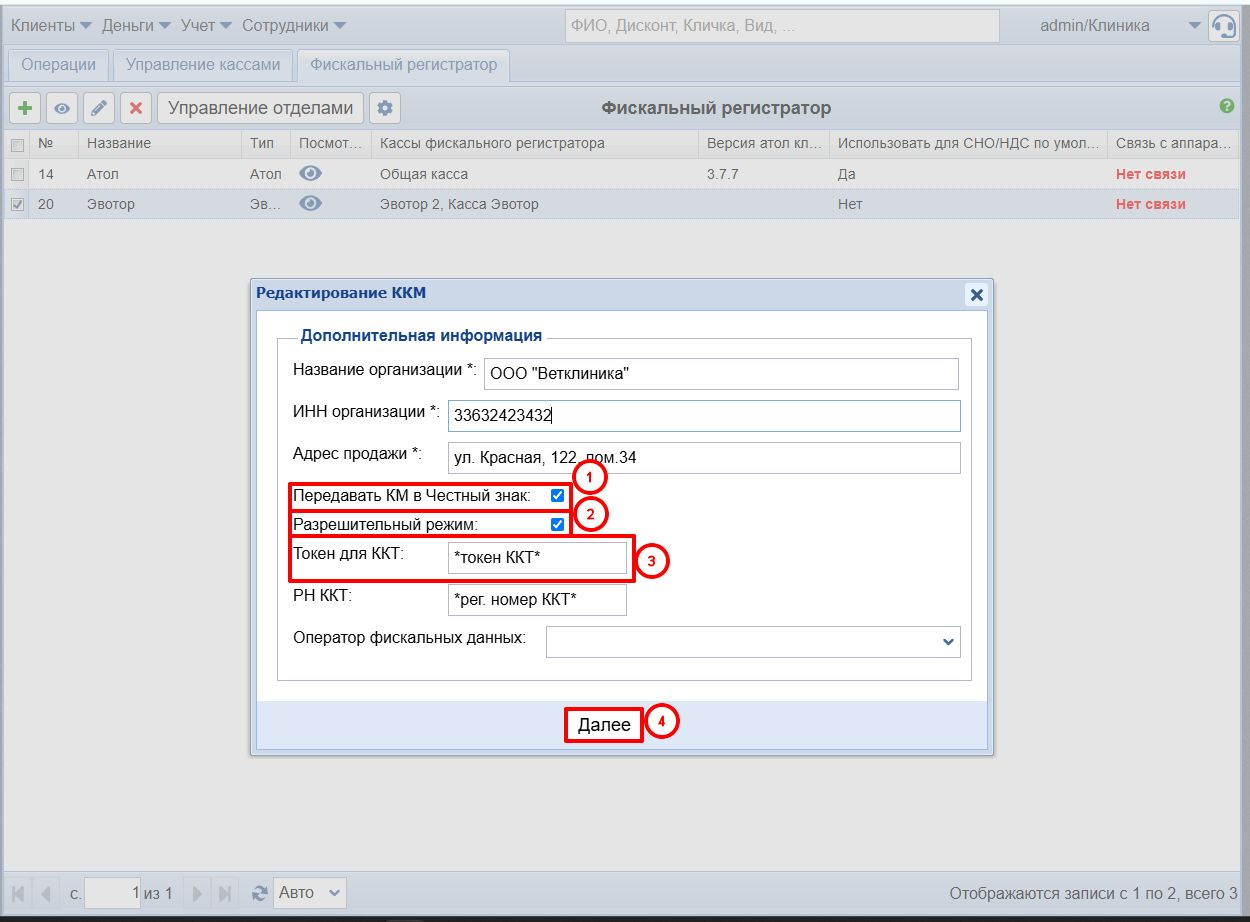 | На первой же странице откроется окно для заполнения данных. Галочка "Разрешительный режим" по умолчанию скрыта. Чтобы галочка стала видимой, активируйте чекбокс “Передавать КМ в Честный знак”. | Если у вас АТОЛ, данная настройка будет на следующей странице. Нажмите Далее. Чтобы галочка "Разрешительный режим" стала видимой, активируйте чекбокс “Передавать КМ в Честный знак”. |