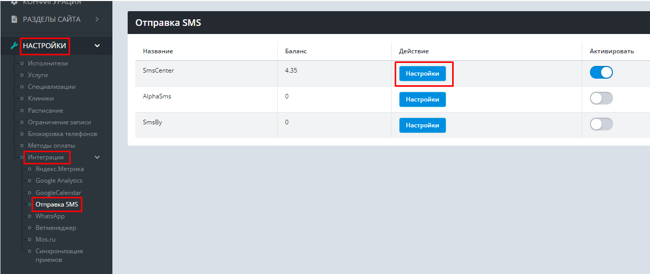 После этого необходимо перейти в виджете в Настройки - Интеграции - Отправка SMS. Выбрать нужный сервис отправки и нажать кнопку Настройка напротив него.
