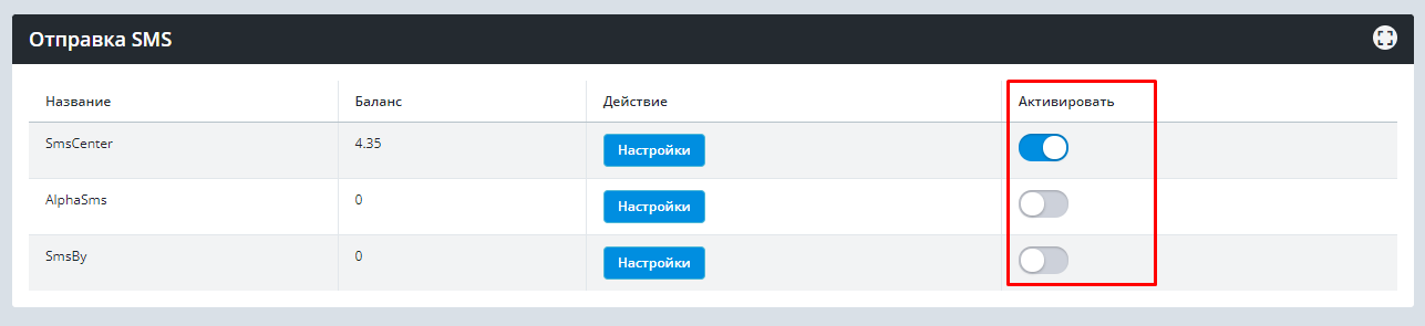 Нажмите кнопку Сохранить. Потом – кнопку Активировать. Либо нажмите кнопку Вернуться к списку и передвиньте серый бегунок в столбце Активировать напротив нужного сервиса смс-рассылок.
