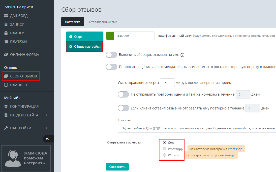 Чтобы начать собирать отзывы с посетителей, необходимо сделать определенные настройки. В kwikbi переходим в Сбор отзывов - Общие настройки - нажимаем Включить сборщик отзывов по смс. И делаем настройку, когда отправлять смс клиенту