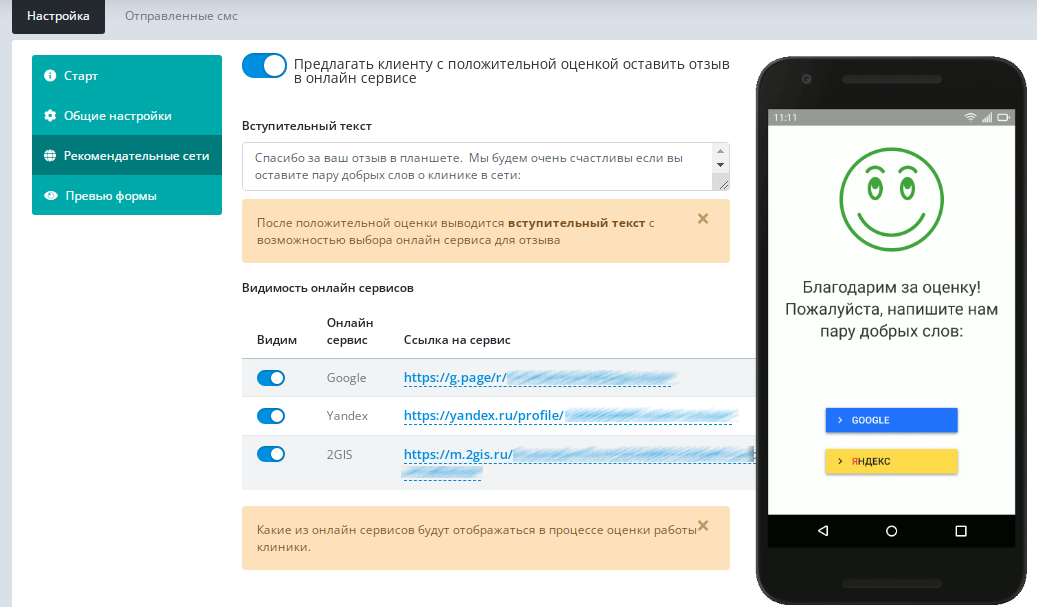 Напишите вступительный текст, в котором просите клиента оставить отзыв (он будет виден после положительной оценки), и сохраните. Добавьте ссылки на вашу клинику на онлайн-сервисах (google, yandex или 2GIS)
