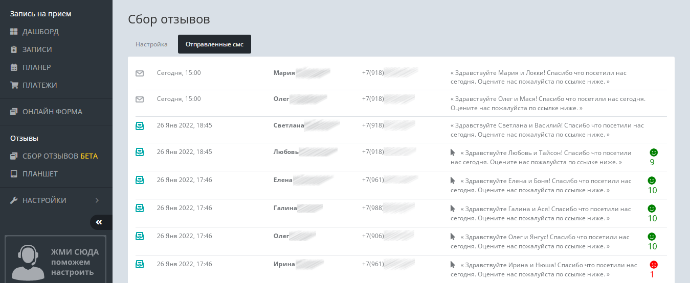 Посмотреть, кому и какие сообщения отправились и какие оценки оставили клиенты, можно в разделе Сбор отзывов - Отправленные смс.