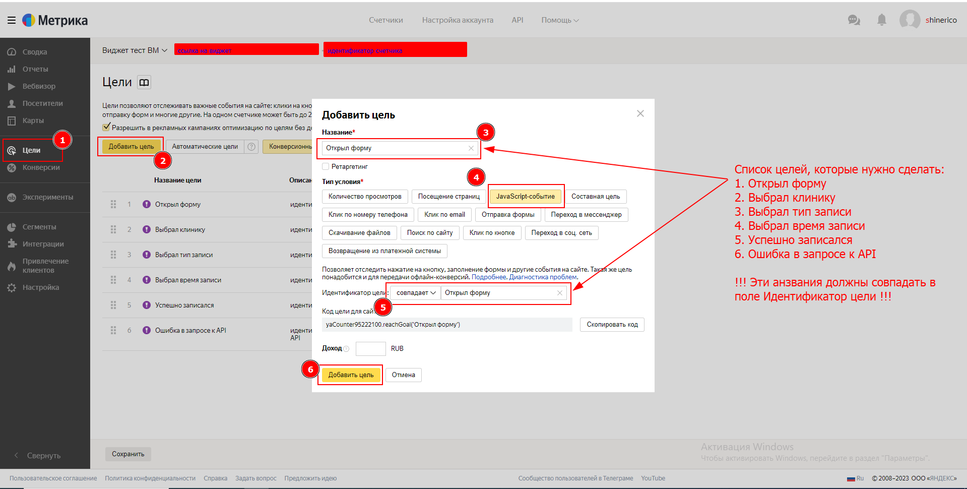После этого в Яндекс.Метрике нужно создать 6 целей из этого списка: