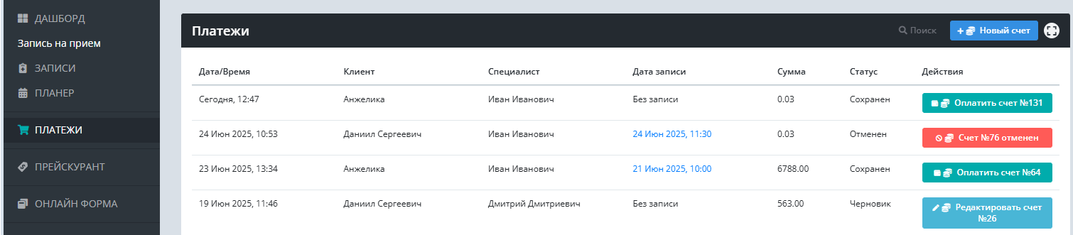 В разделе "Платежи" отображаются все счета, созданные в системе. Здесь можно: