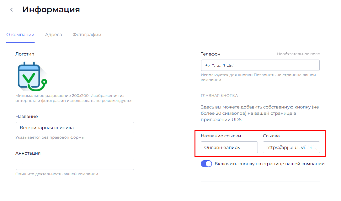 В личном кабинете UDS  в профиле компании в блоке "Главная кнопка" вставьте эту ссылку под названием “Онлайн запись”