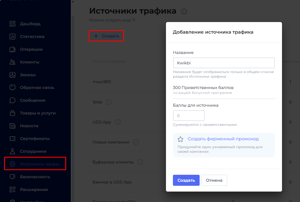 - После создания источника нажмите рядом с ним кнопку Промокод.