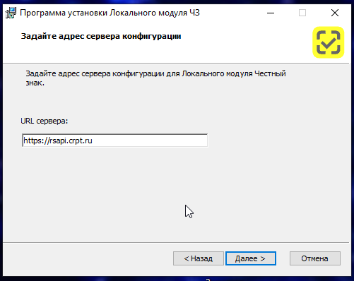 • Поле URL сервера оставляйте как есть - https://rsapi.crpt.ru. Нажмите Далее.