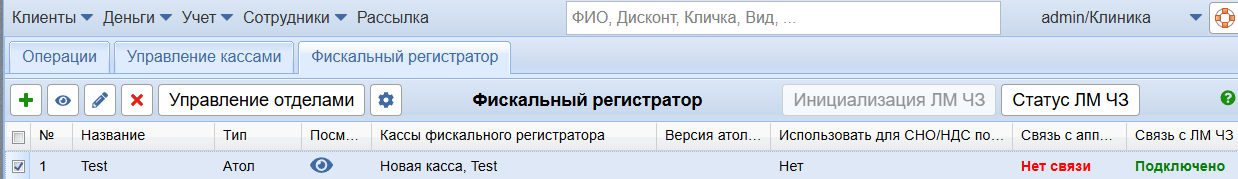 Если в столбце “Связь с ЛМ ЧЗ” показывает любой статус, кроме “Подключено”, необходимо выбрать фискальный регистратор и нажать на кнопку “Статус ЛМ ЧЗ”.