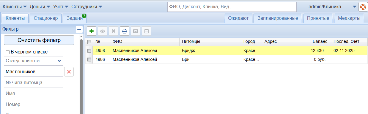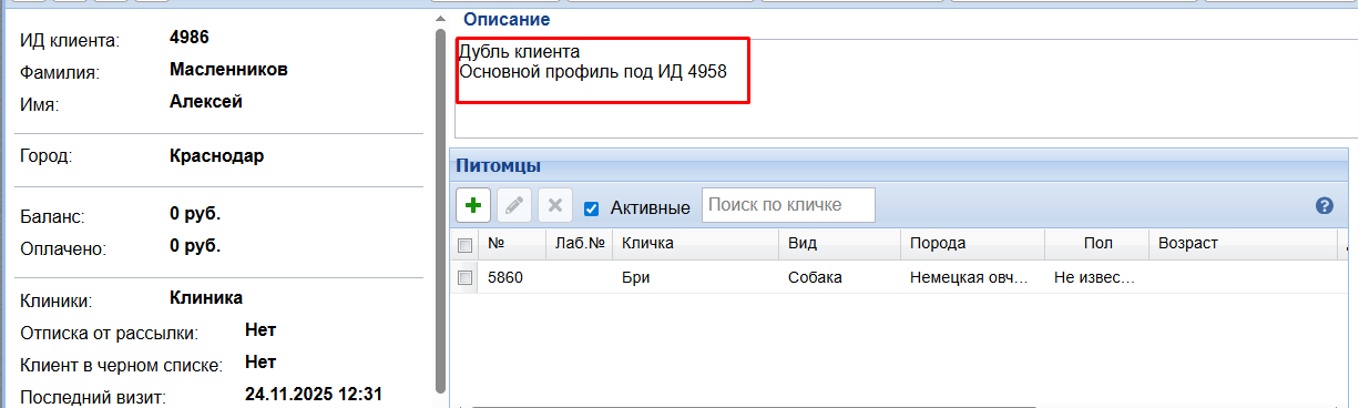 Если у дублирующего профиля есть питомец с медицинскими картами, его можно перенести в основной профиль клиента, чтобы не потерять историю лечения.