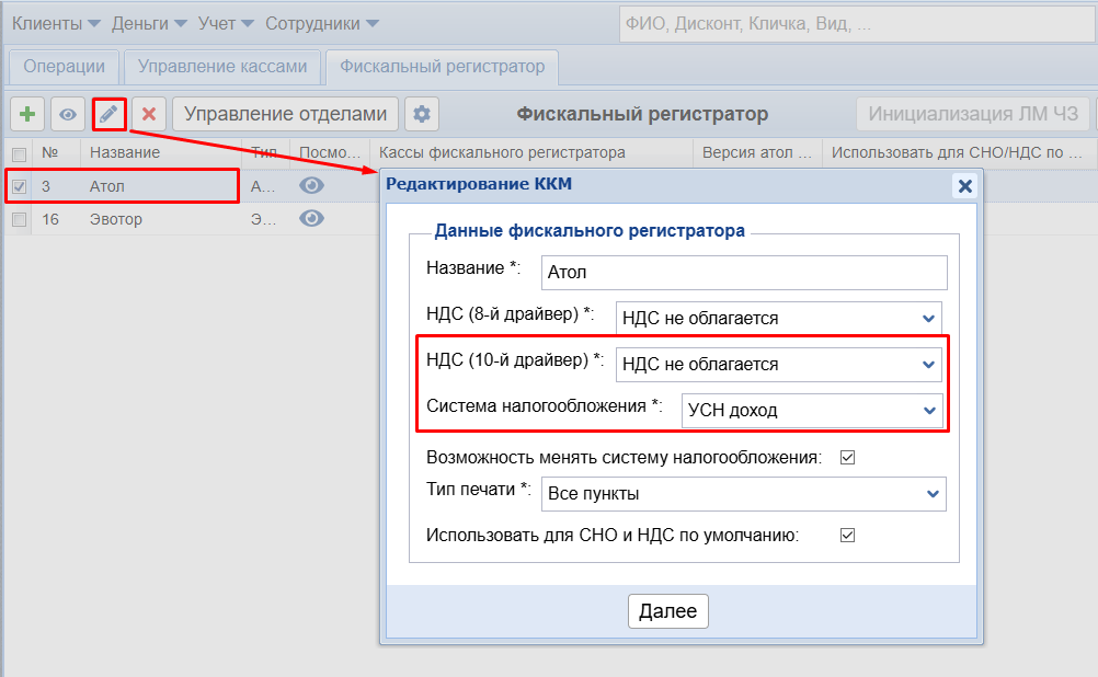Выберите вашу систему налогообложения и НДС (в разделе 10-й драйвер). Несколько раз нажмите Далее и сохраните изменения.