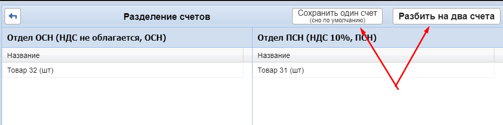При сохранении счета, в котором есть позиции из разных отделов, программа автоматически предложит разбить счет на два.