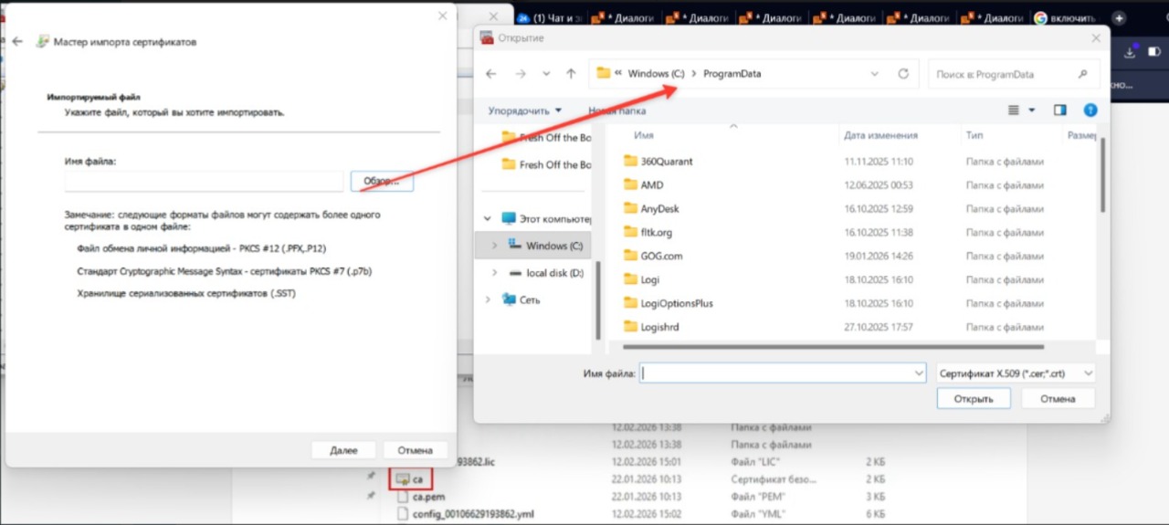 После установки драйвера ТС ПИоТ необходимо добавить два сертификата: ca.crt и server.crt в доверенные.