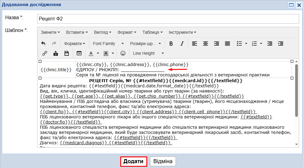 Зверніть увагу: у номер рецепта за замовчуванням підтягується номер медкарти. Якщо вам потрібна власна нумерація, відредагуйте шаблон і встановіть змінну текстового поля для заповнення: