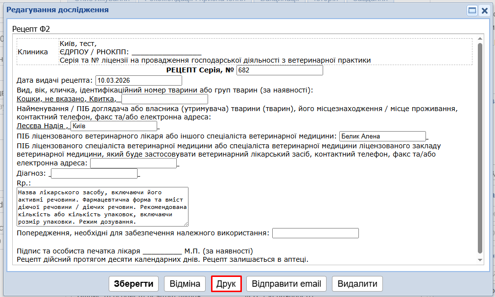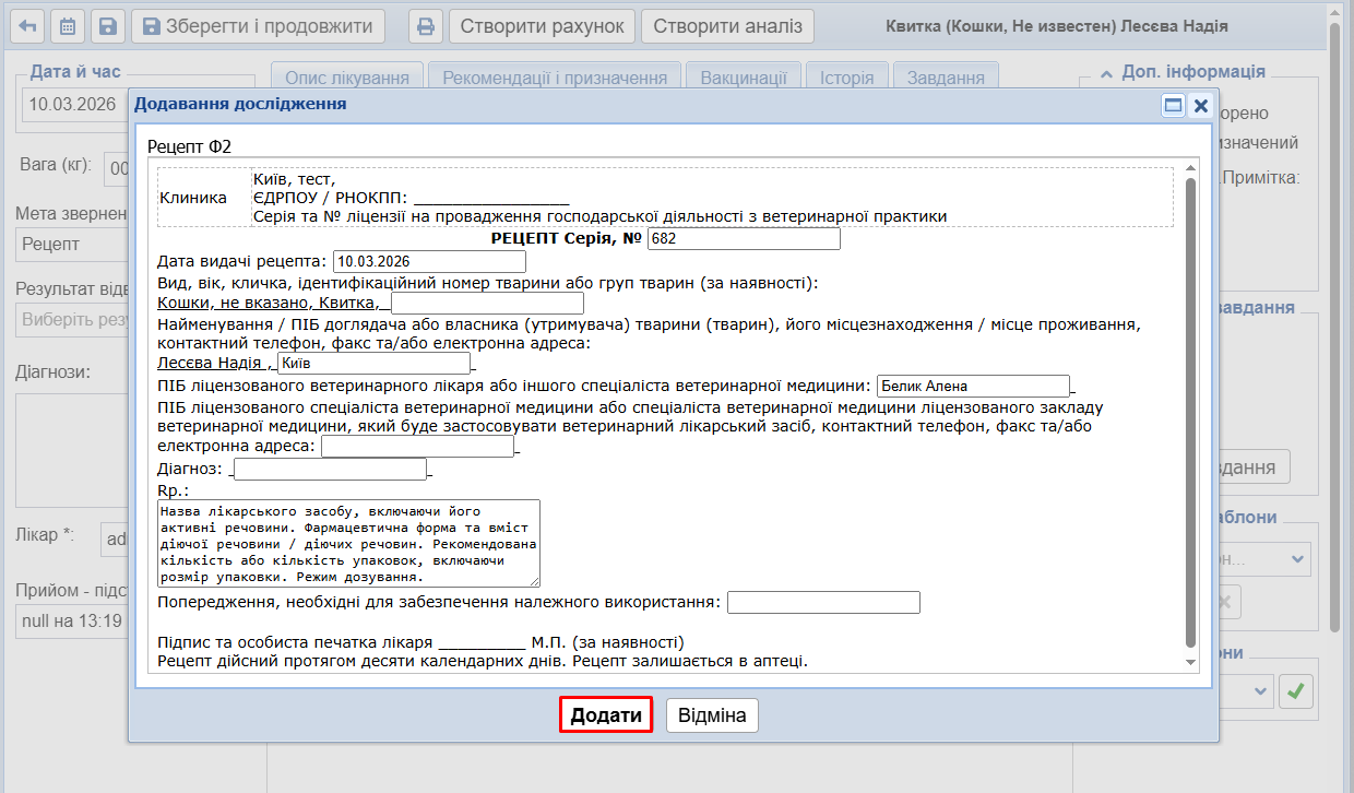 Щоб заповнити рецептурний бланк у програмі Ветменеджер, створіть медкарту на улюбленця та додайте до неї відповідний спеціальній шаблон.