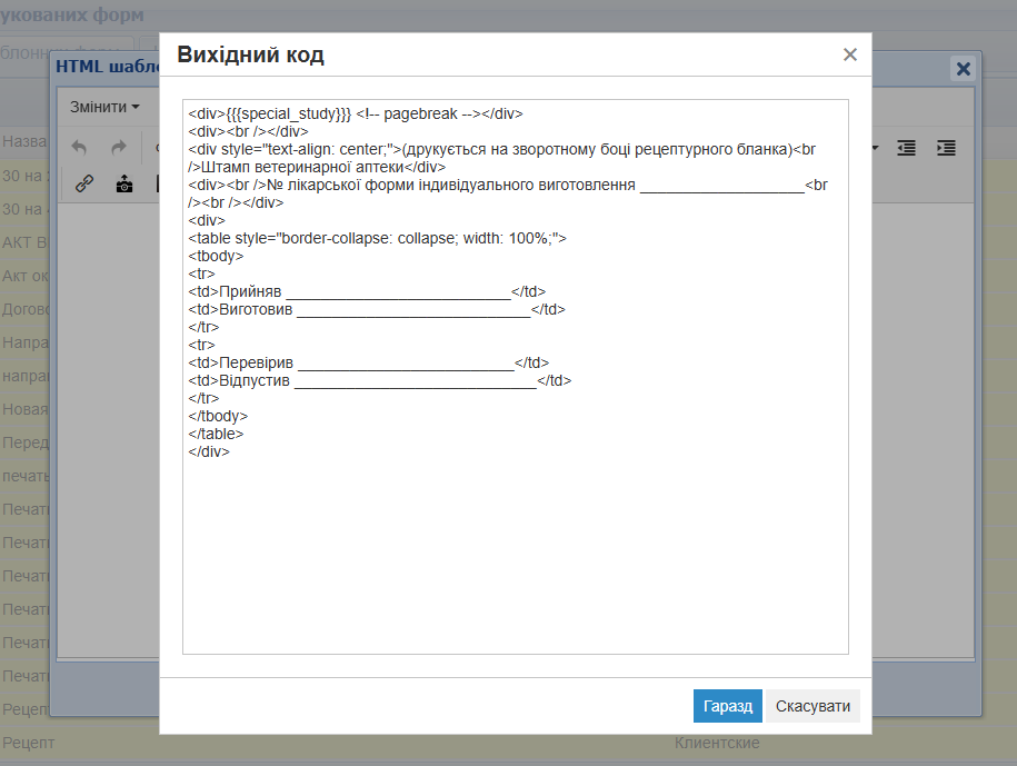 Відкрийте на ПК завантажений шаблон друкованої форми та скопіюте код з нього. Вставте його у вікно "Вихідний код". Натисніть гараз і збережіть друковану форму.