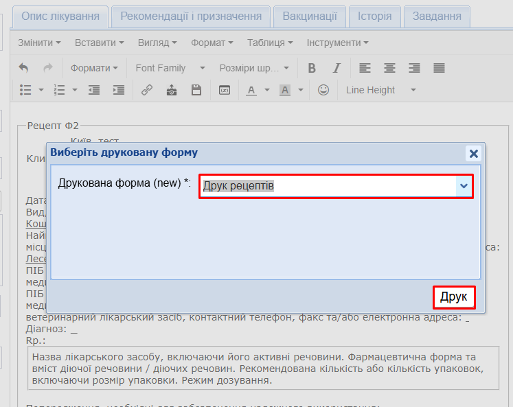 Використовуйте цю друковану форму під час друку рецептурного бланка з медкарти. Таким чином у документ не підтягуватиметься нічого зайвого, окрім самого бланка.