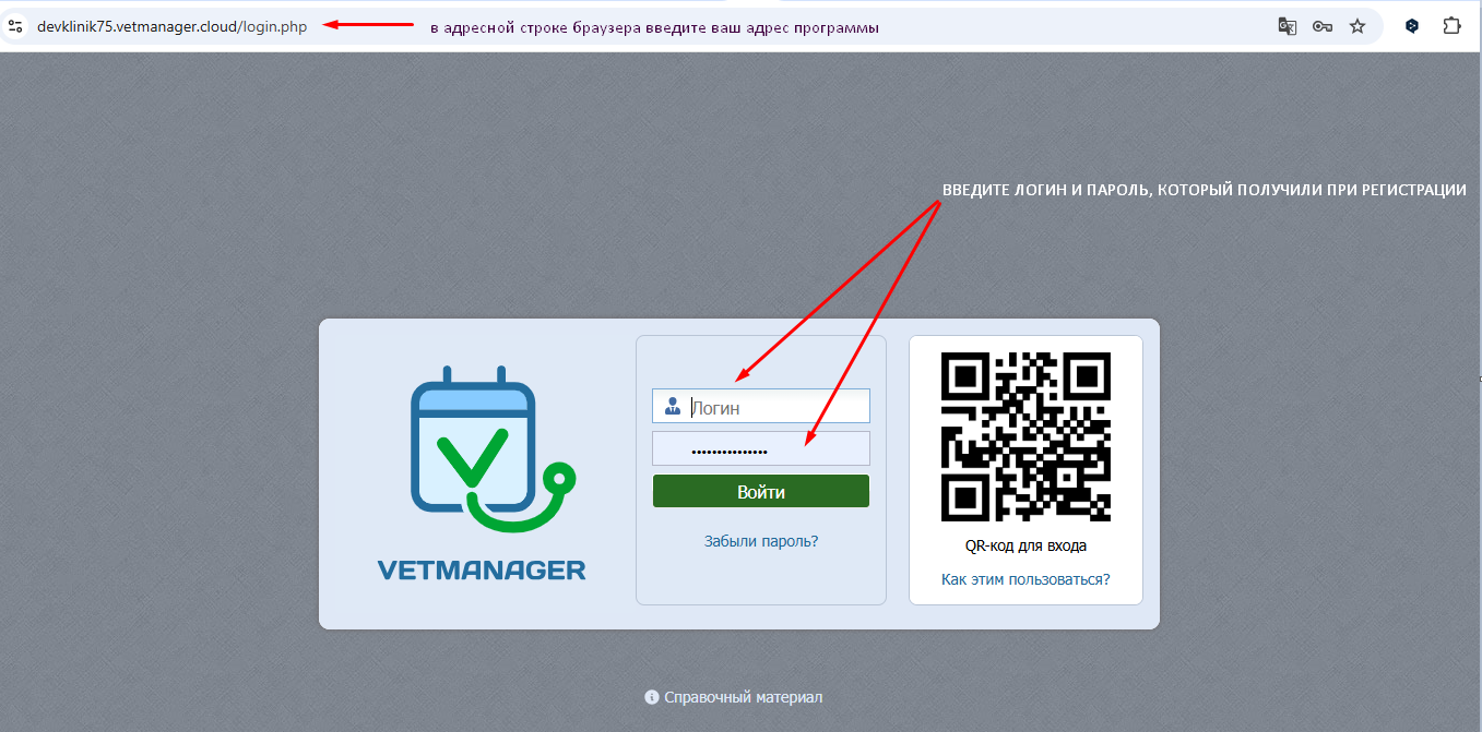 После регистрации вы получите адрес для входа в формате домен.vetmanager2.ru или домен.vetmanager.cloud, где домен - это ваше уникальное имя. Используя этот адрес и логин/пароль вы сможете заходить в программу с любого ПК.